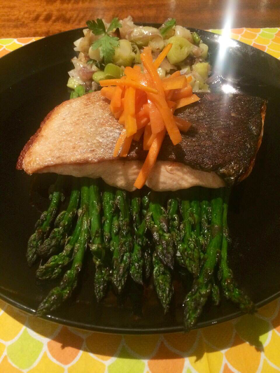 Place a large non-stick frying pan on high heat, once the pan is piping hot add a drizzle of olive oil, then fry the fish skin side down for 5-7 minutes, or until the skin is crispy but fish is still raw in the middle- this is tricky, be sure to keep an eye on it. Using a spatula, check if the skin is crispy, once it is, flip the fish over and fry for 20 seconds. Then add the julienned carrots to the pan along with the fish oil and a generous pinch of salt- fry for 30 seconds, then drain the carrots of any excess oil.