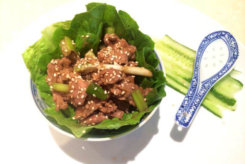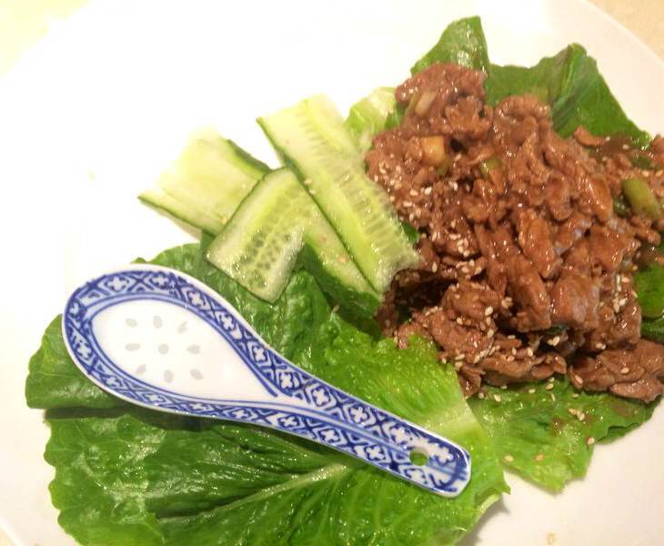 To serve, sprinkle the toasted sesame seeds onto the meat, and make wraps with the lettuce and cucumber.