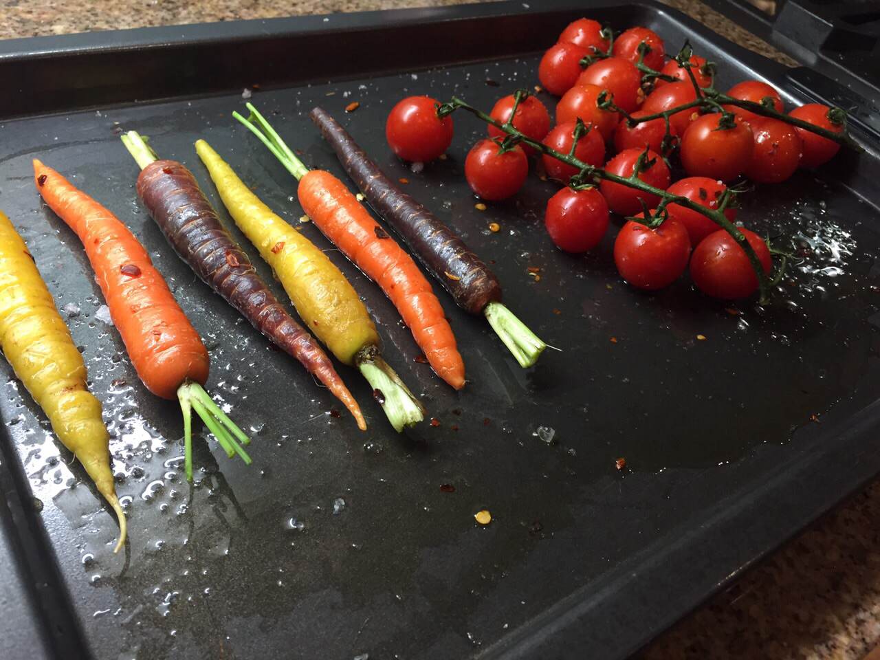 Season the tomatoes and carrots with a large pinch of sea salt, black pepper, the chilli flakes and a drizzle of olive oil, place on an oven tray and roast for 10-12 minutes.