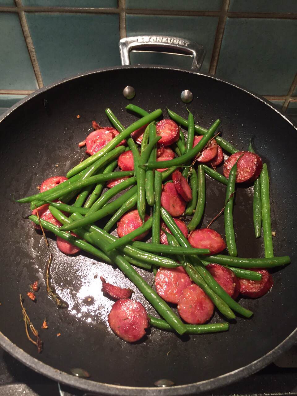 Place a small pot on high heat, add boiling water and the green beans, boil for 3 minutes (don’t overcook the beans). While the beans are cooking place a non-stick frying pan on high heat and fry the chorizo and thyme for 1 minute on each side or until slightly crispy, once the beans are cooked, add them to the pan and fry for 30 seconds.